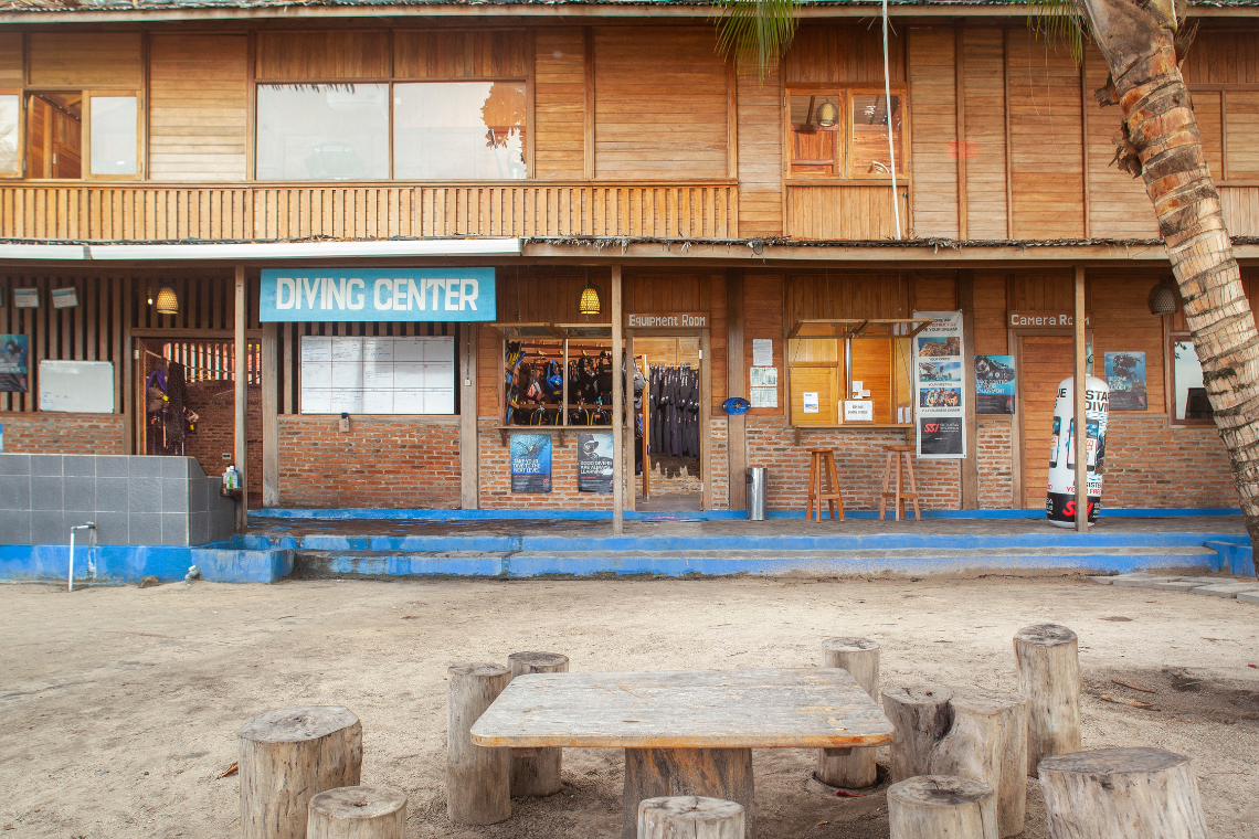 Het Duikcentrum is het centrale element op het resort. Gebouwd met aandacht voor de flora en fauna en om deze en het rif te beschermen is ervoor gekozen om geen boot steiger aan te leggen, maar de boten direct het zandstrand op te varen om vanaf daar eenvoudig te kunnen opstappen.
