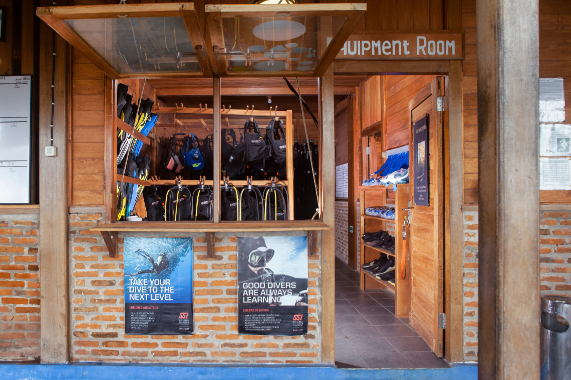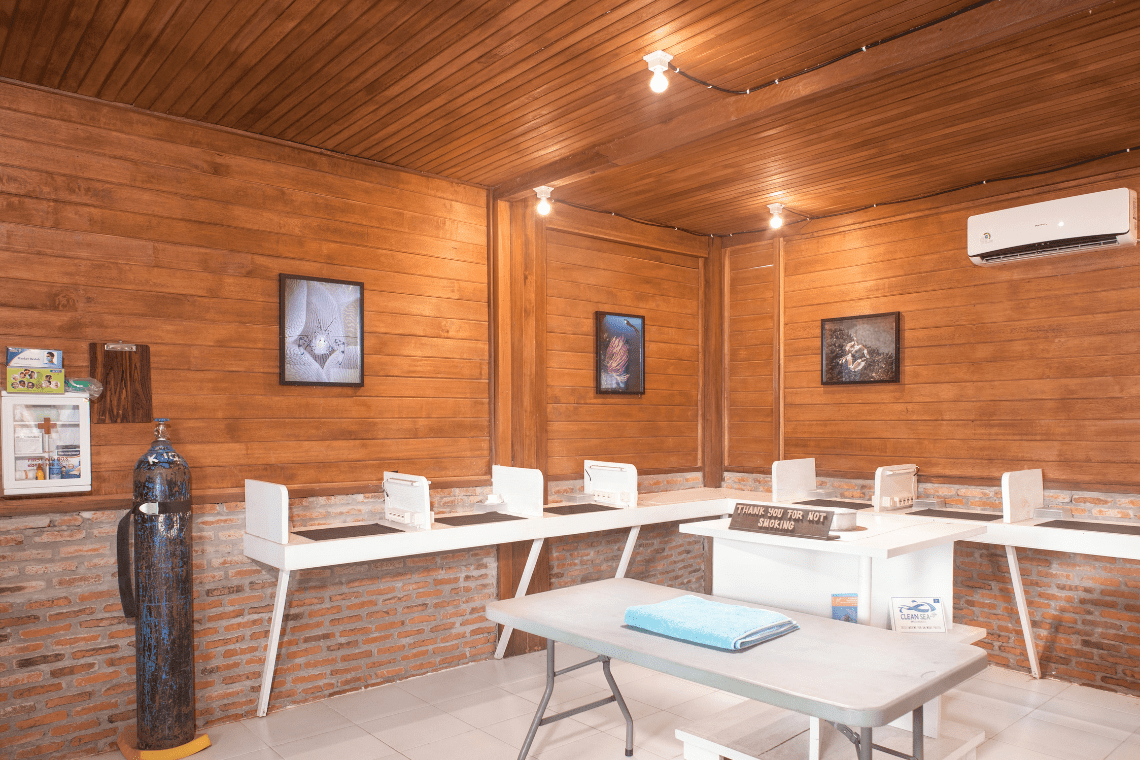 Het duikcentrum heeft een grote ruimte met individuele "hokjes" om je uitrusting te laten drogen en een grote ruimte voorzien van airconditioning voor het opslaan en verzorgen van je camera uitrusting.