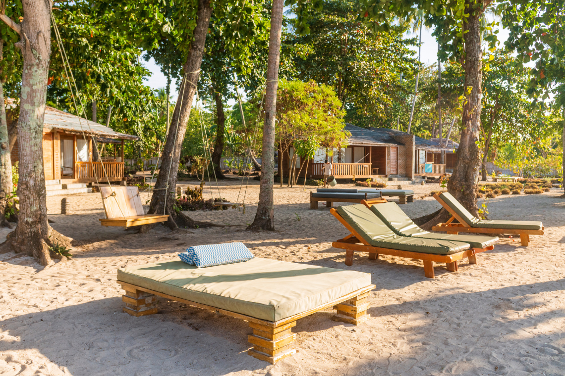 Deze fijne bungalows van 60m2, liggen in de heerlijke tuin iets verder van zee en hebben een grote glazen pui aan de veranda, waardoor je prachtig zicht hebt op de zee tussen de strand bungalows door. De bungalows zijn voorzien van airconditioning, beschikken over een groot dubbel bed, inloop kast, minibar, muziek installatie en een extra grote semi-open badkamer met douche en dubbele wastafel.